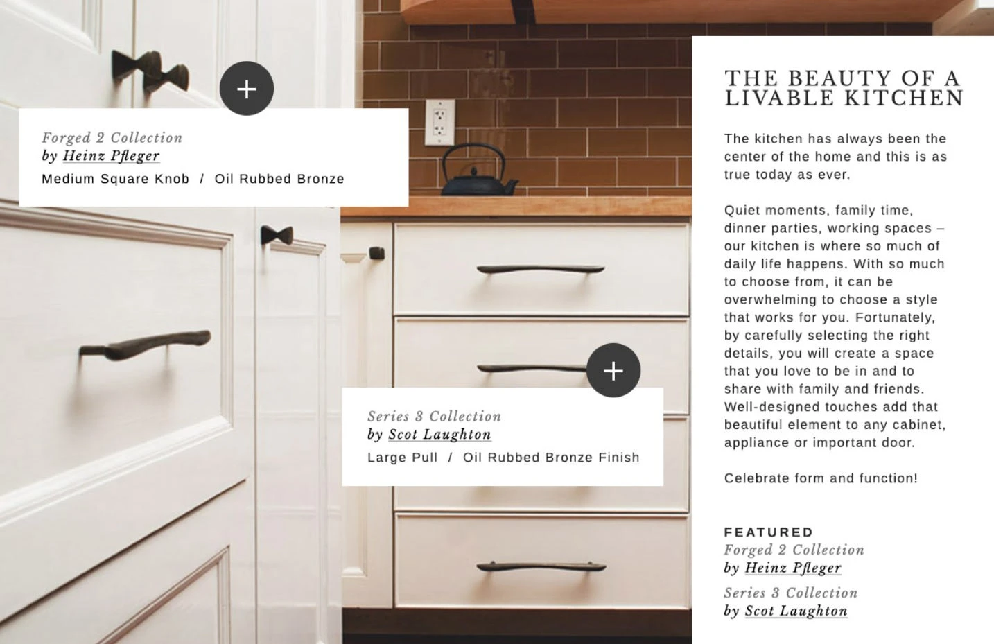 Original cabinet hardware designed by the great metal smith, Heinz Pfleger. Forged 2 has classic shapes and retains the handmade qualities of the original forged pieces on which the collection is based. Forged 2 is the perfect completing element for your kitchen, bath and fine furniture.