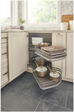 Optimize corner cabinets with a classic 28″ kidney banded wood lazy Susan set. 5/8″ birch plywood tray construction makes for a secure shelf. Telescoping pole locks in place at your desired height. Beige polymer shelf bearings blend into the wooden shelves. Simple pin and hole adjustment of shelves. Each shelf is independently rotating, and kidney hubs have a positive stop, so cutout stops at the door opening. Each unit is tested to exceed BHMA Class-1 specifications of 20 pounds per square foot for 75,000 cycles. For cabinet interiors heights of 24-1/2″ to 32-3/4”. Set includes two shelves, pole, all mounting hardware, and installation instructions. Our banded wood series is our most economical offering in wood lazy Susans.