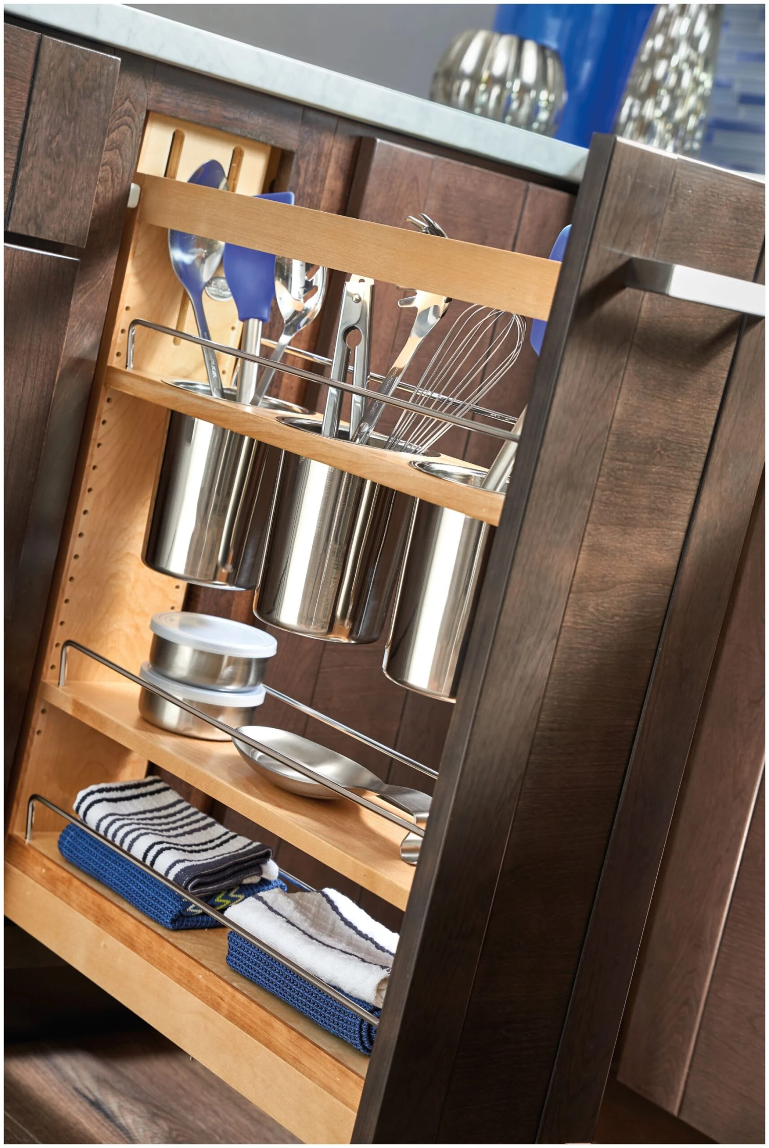 Rev-A-Shelf’s beautiful base organizers feature adjustable shelves with chrome rails to help keep everything in its place. Stop digging through drawers for utensils and say goodbye to unsightly, space monopolizing counter bins with the 448UT pullout designed specifically for storing a multitude of utensils. Units glide out on the BLUMOTION soft- close slide system, which is some of the industry best slides. Door mounting is easy with our patented door mount brackets that provide up to 5 inches of flexibility for trouble free installation on any door style.