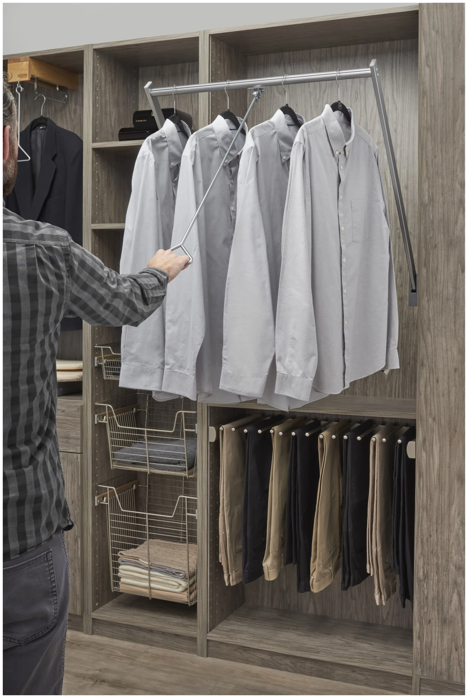 Maximize your closet space with the Sidelines by Rev-A-Shelf pulldown closet rod that pulls down and out, giving you complete accessibility to your clothes. Available in a luxurious satin chrome finish, its unique cut-to-size design fits a range of openings.