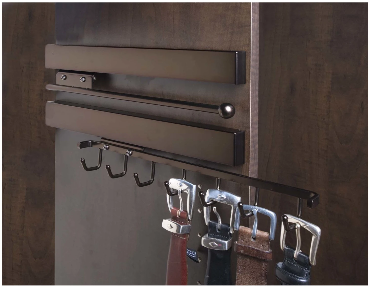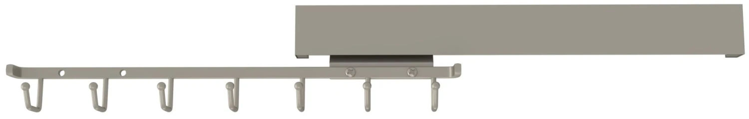 Offering easy to reach storage for your belt, the deluxe belt rack complements our other deluxe accessories for storage of ties, scarves, and more. It stores against a closet panel and then slides out when needed from behind clothes on full extension, ball-bearing, steel slides. See your collection of belts on this elegant rack featuring 7 hooks on a steel frame. It is available for 14″ or greater depth panels in several luxurious finishes to match Sidelines by Rev-A-Shelf’s other accessories.
