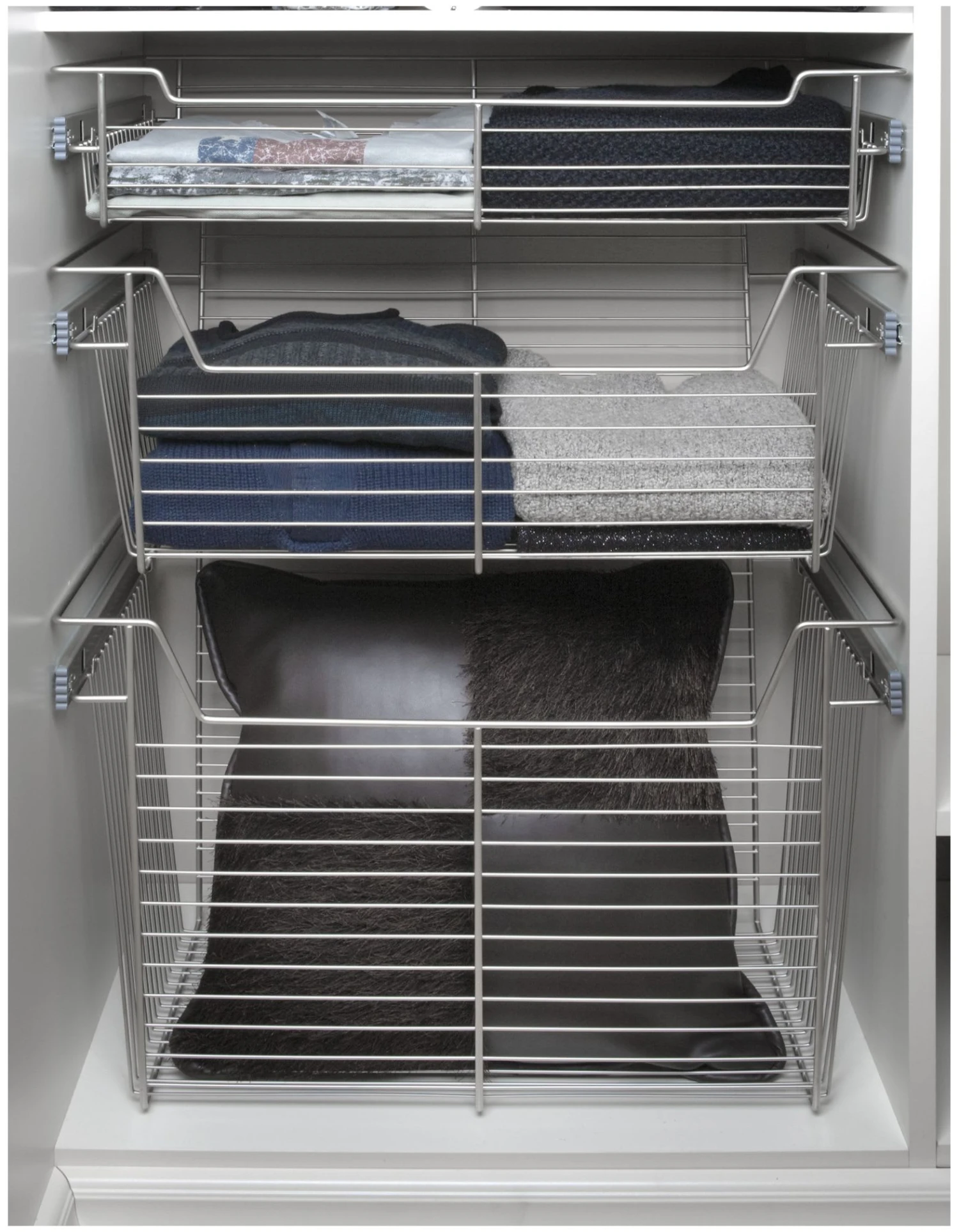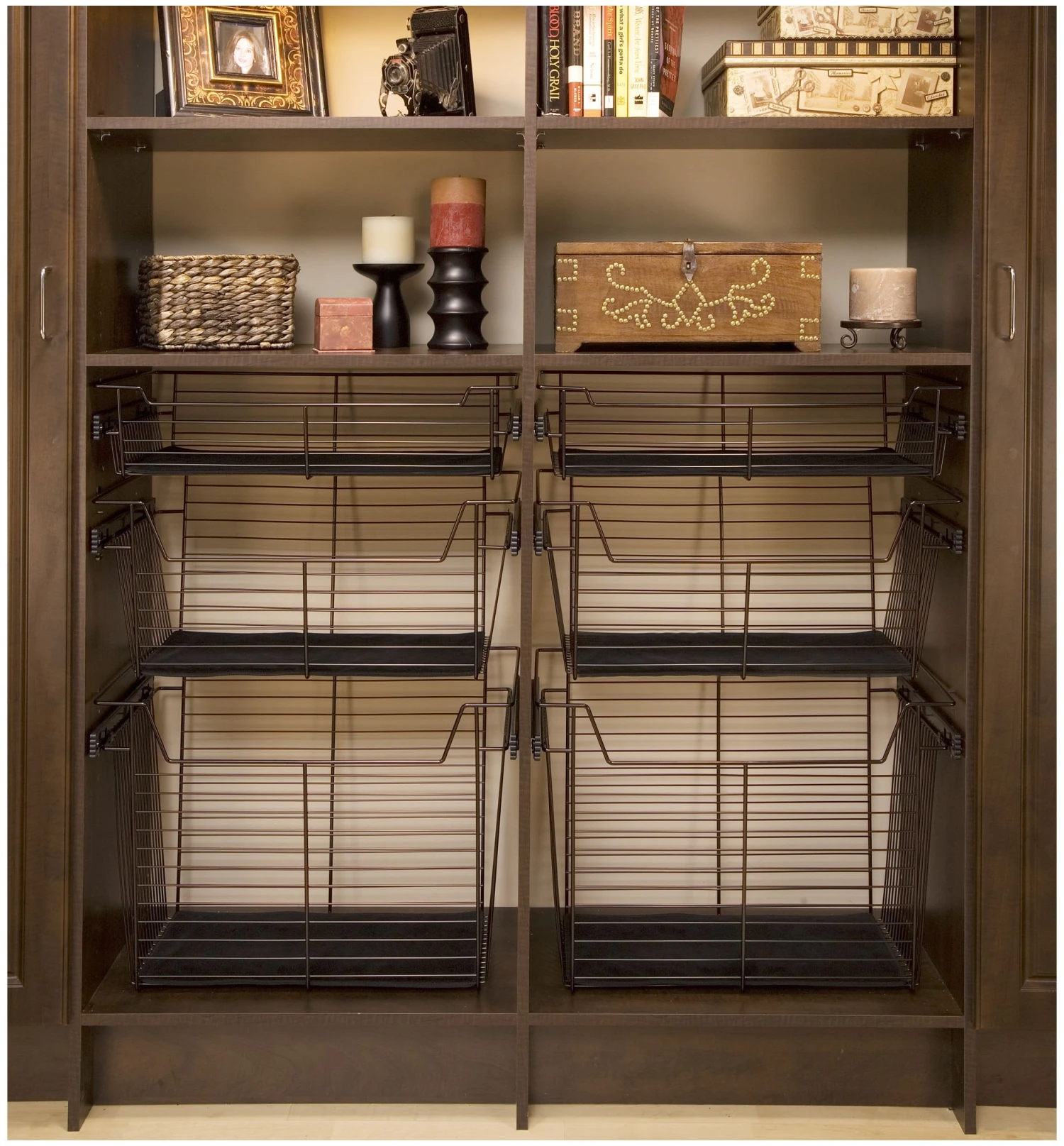 The original, Sidelines’ patented baskets feature full extension, ball-bearing slides and are available in several luxury finishes, from chrome to bronze, in a variety of sizes. The basket slides permit mounting into fixed cabinet sections for closet, laundry, kitchen or pantry for use like a drawer.