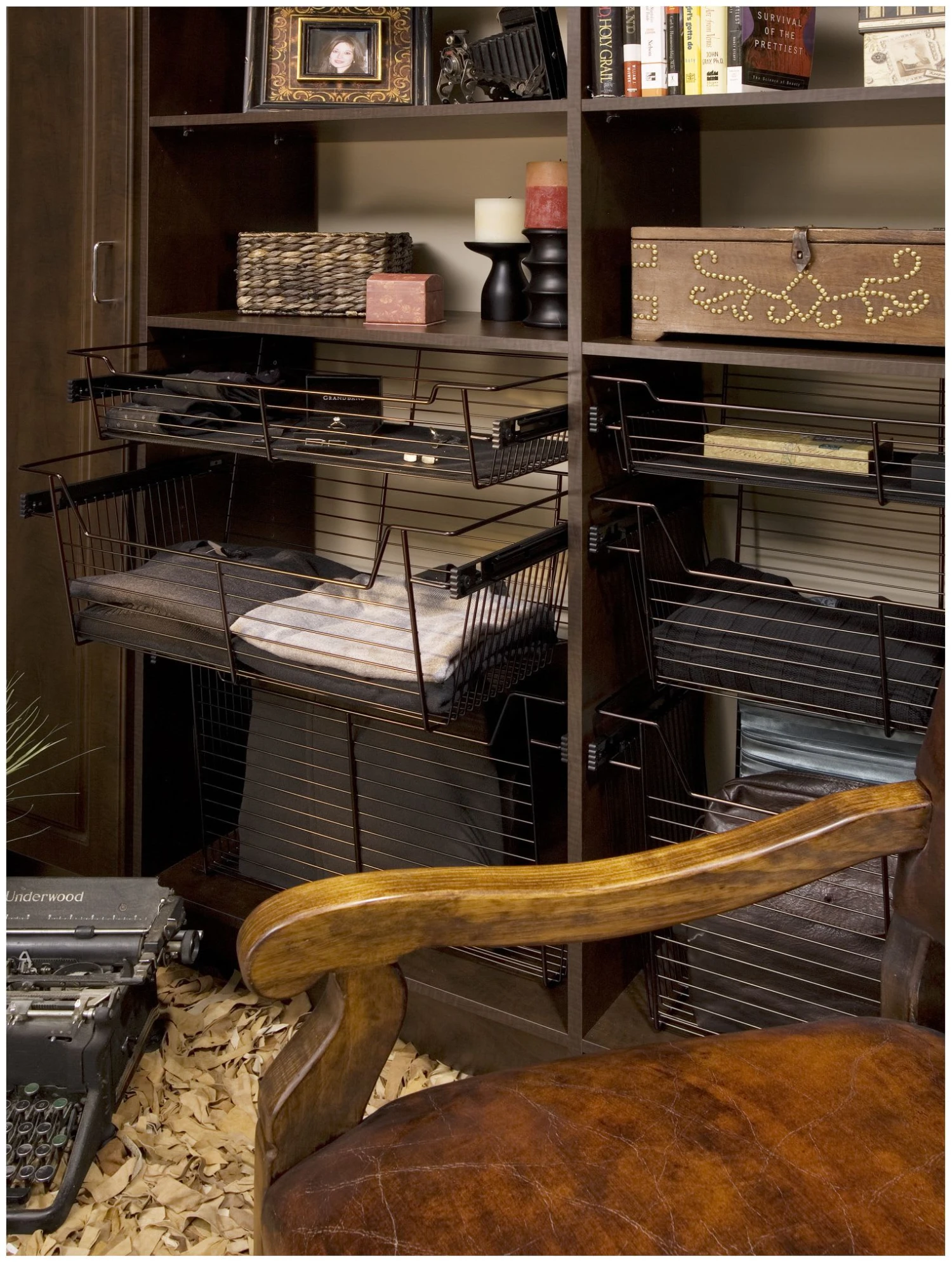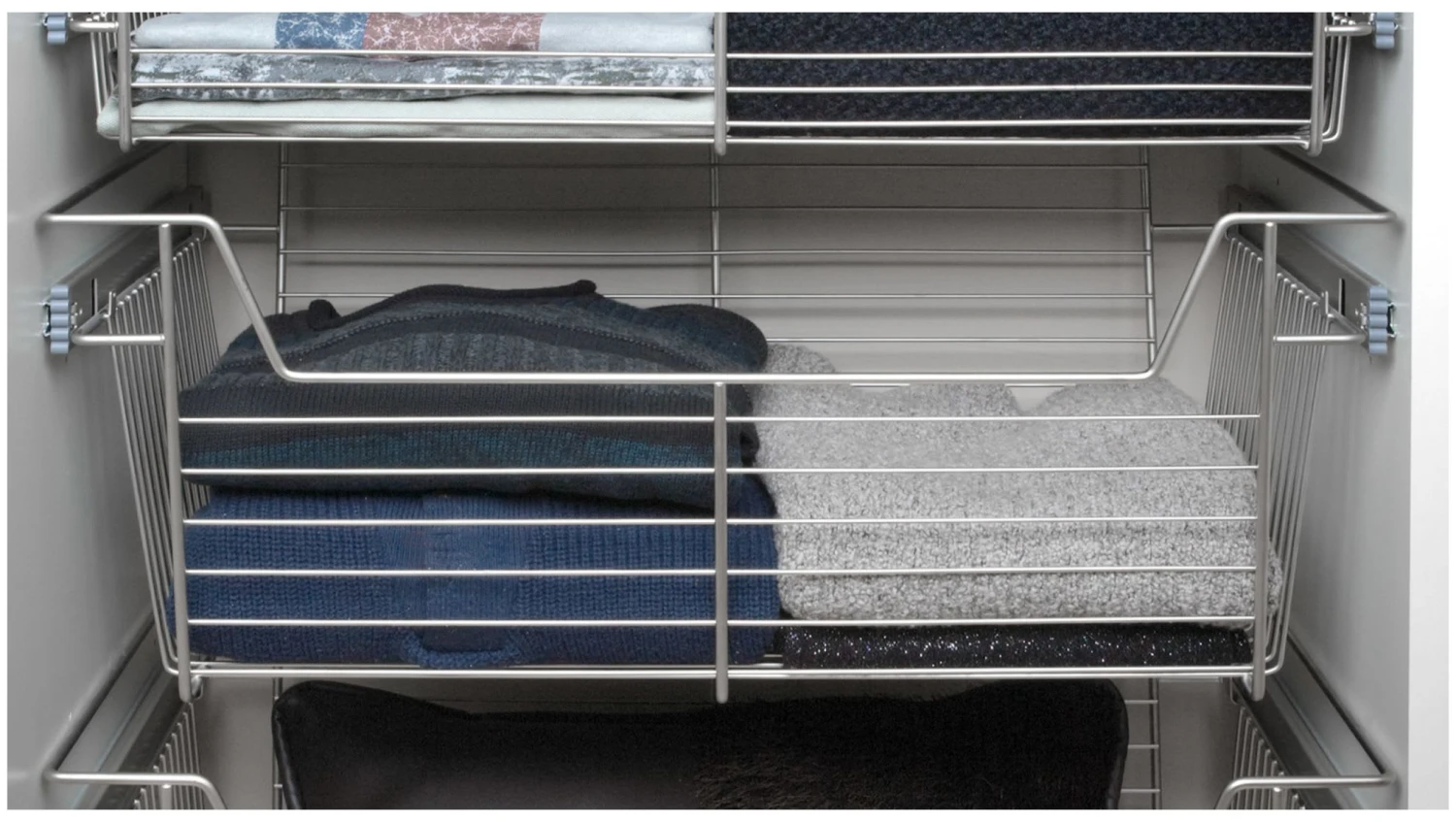 The original, Sidelines’ patented baskets feature full extension, ball-bearing slides and are available in several luxury finishes, from chrome to bronze, in a variety of sizes. The basket slides permit mounting into fixed cabinet sections for closet, laundry, kitchen or pantry for use like a drawer.