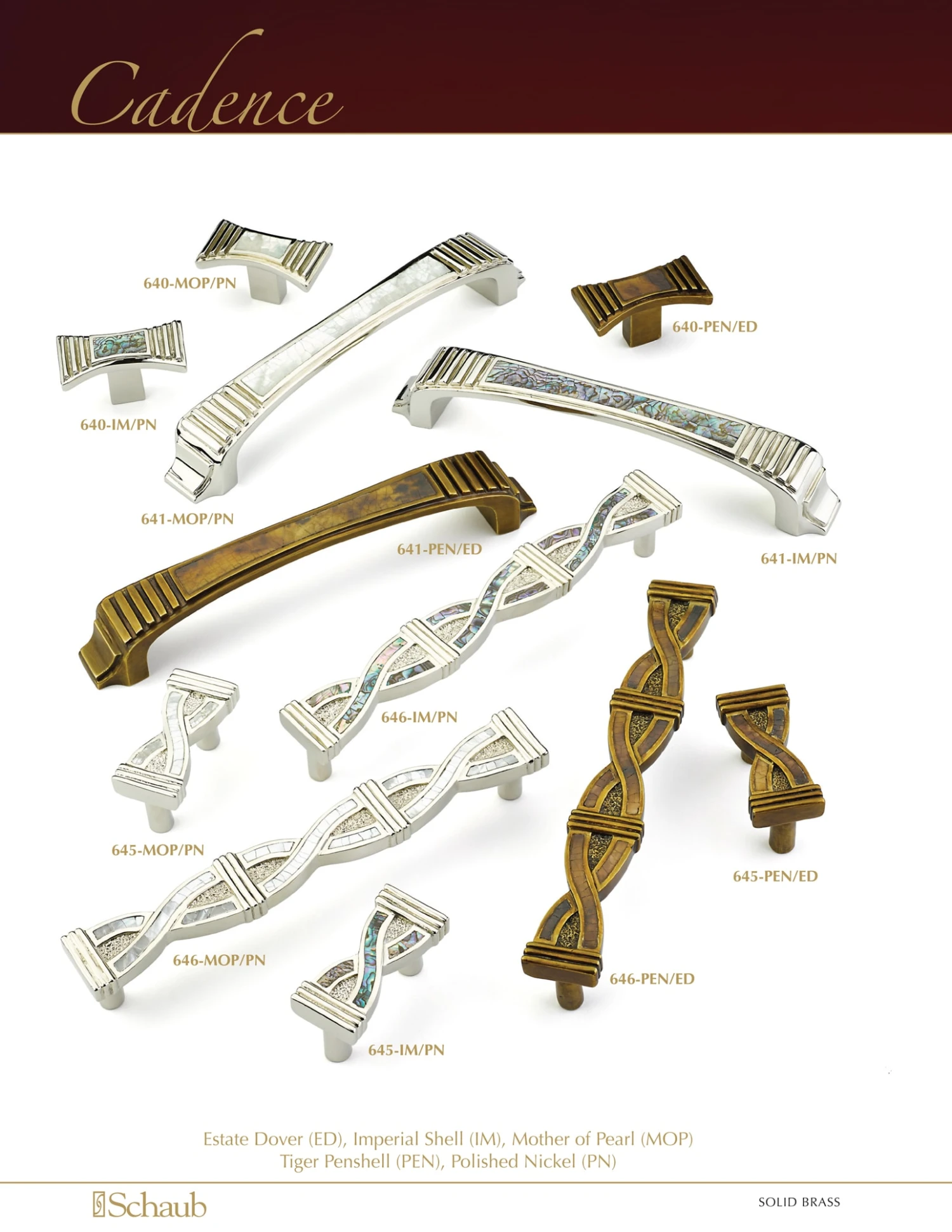 Schaub and Company’s new Symphony line of cabinet hardware combines premium solid brass construction with beautiful South Pacific organic materials. From the lustrous whites of Mother-Of-Pearl, to the creamy marbling of Tiger Pensell, these stunning pieces will be a perfect accent to your cabinetry.