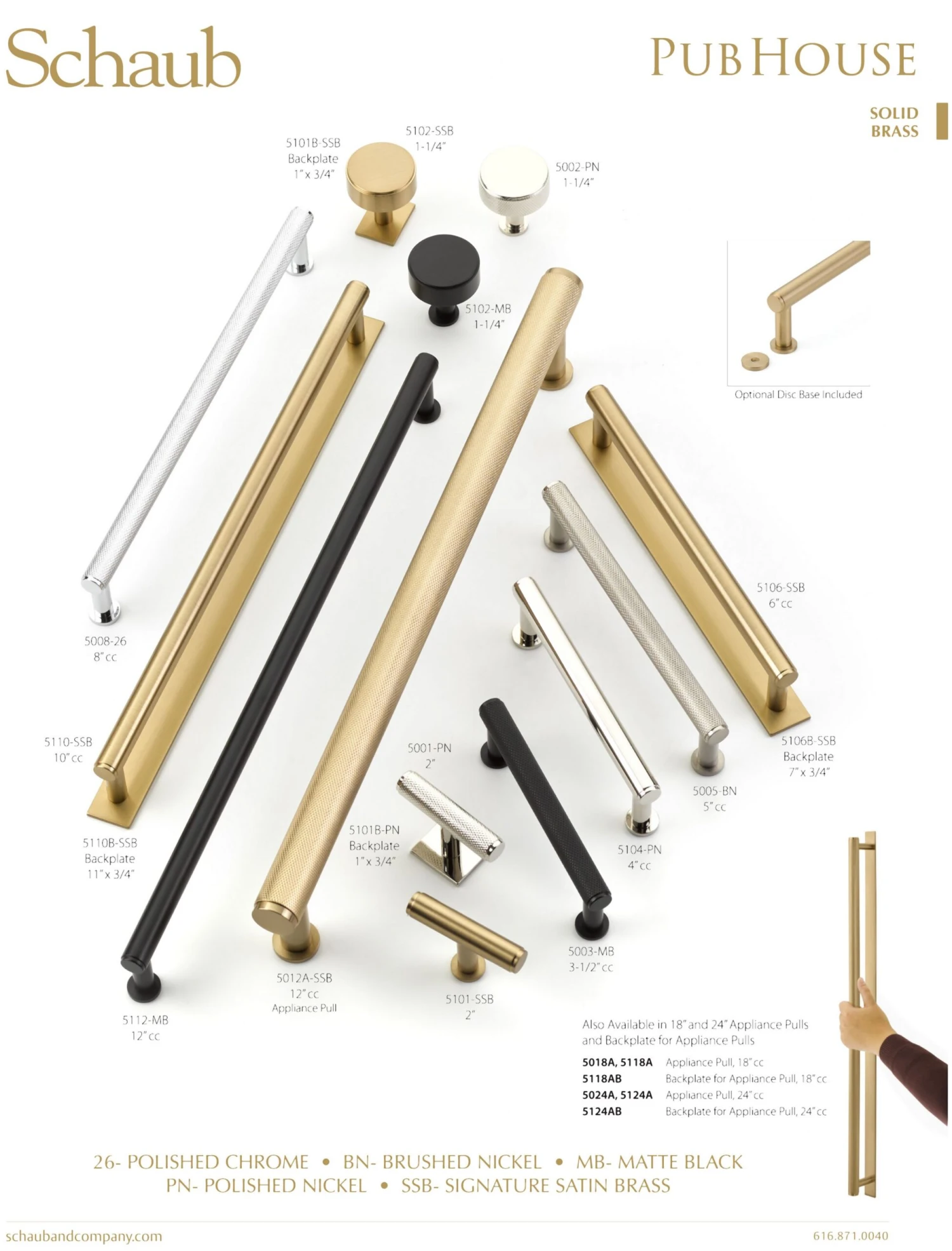 Pub House is an elevated solution to a classic style. Choose between a fine diamond knurling or a smooth texture, as well as an optional disc base– all offered in solid brass. They can also be paired with a rectangular backplate for added presence and panache, sold separately.