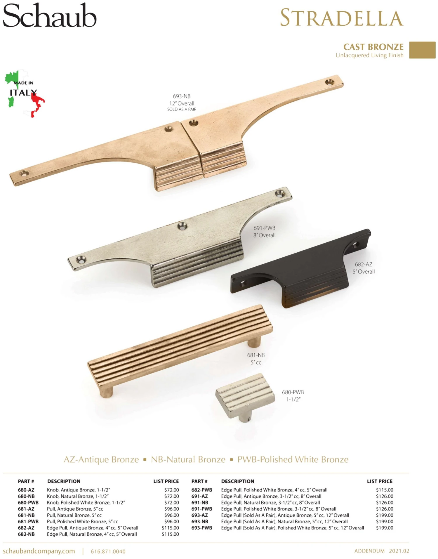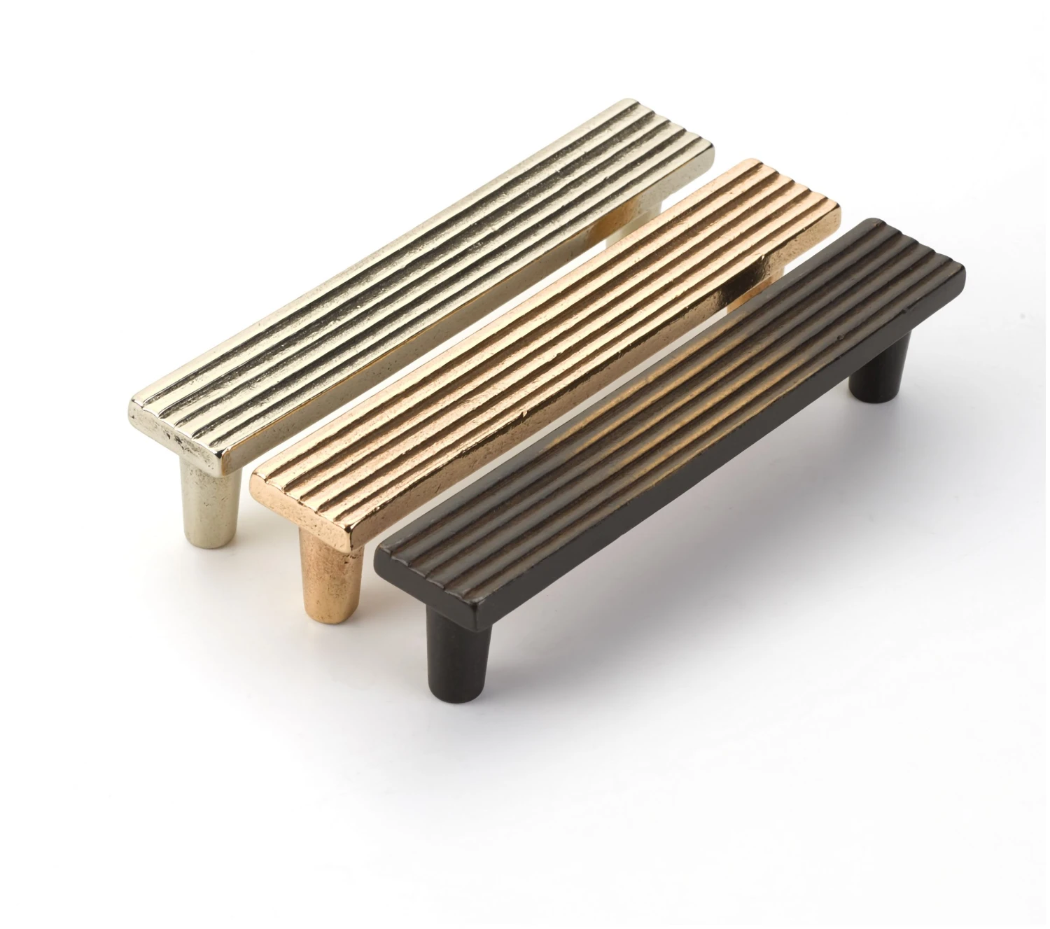 Inspired by the Striation texture of the Italian Alps, Stradella provides a rustic modern look, featuring a contemporary cabinet edge pull profile in a classic bronze material. This cabinet hardware collection is offered in a variety of styles and in 3 finishes: Natural Bronze, White Bronze and Antique Bronze, all of which will develop a sophisticated patina with age and use.